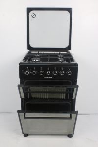 დამატებითი მახასიათებლები:ავტომატური ანთება • სამუშაო ზედაპირი: ემალირებული • გისოსების მასალა: ემალირებული სადგამები • სახურავის მასალა: მინა (შავი კანტით) • კარის მინა: სარკისებური