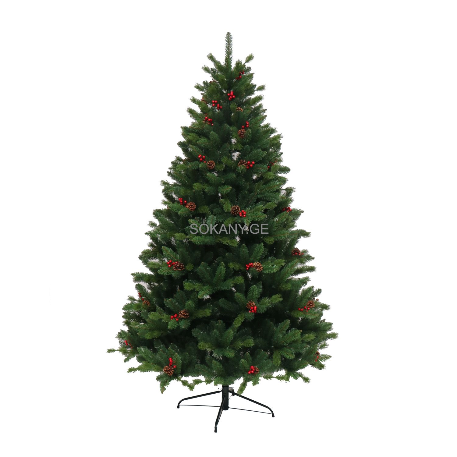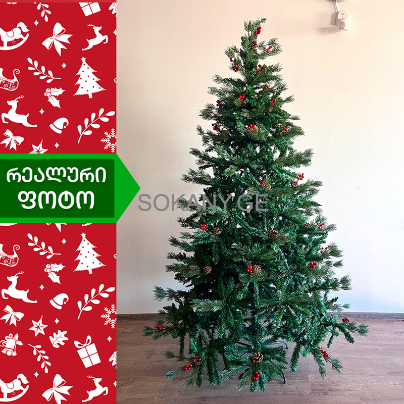 დამატებითი მახასიათებლები:"ნაძვის ხე, გაფორმებული გირჩებით და კენკრით. გამძლე დრეკადი მეტალის ტოტებით და ჯანმრთელობისთვის უსაფრთხო მასალისგან დამზადებული წიწვებით. მეტალის მყარი სადგამით და მთავარი ღერძით.