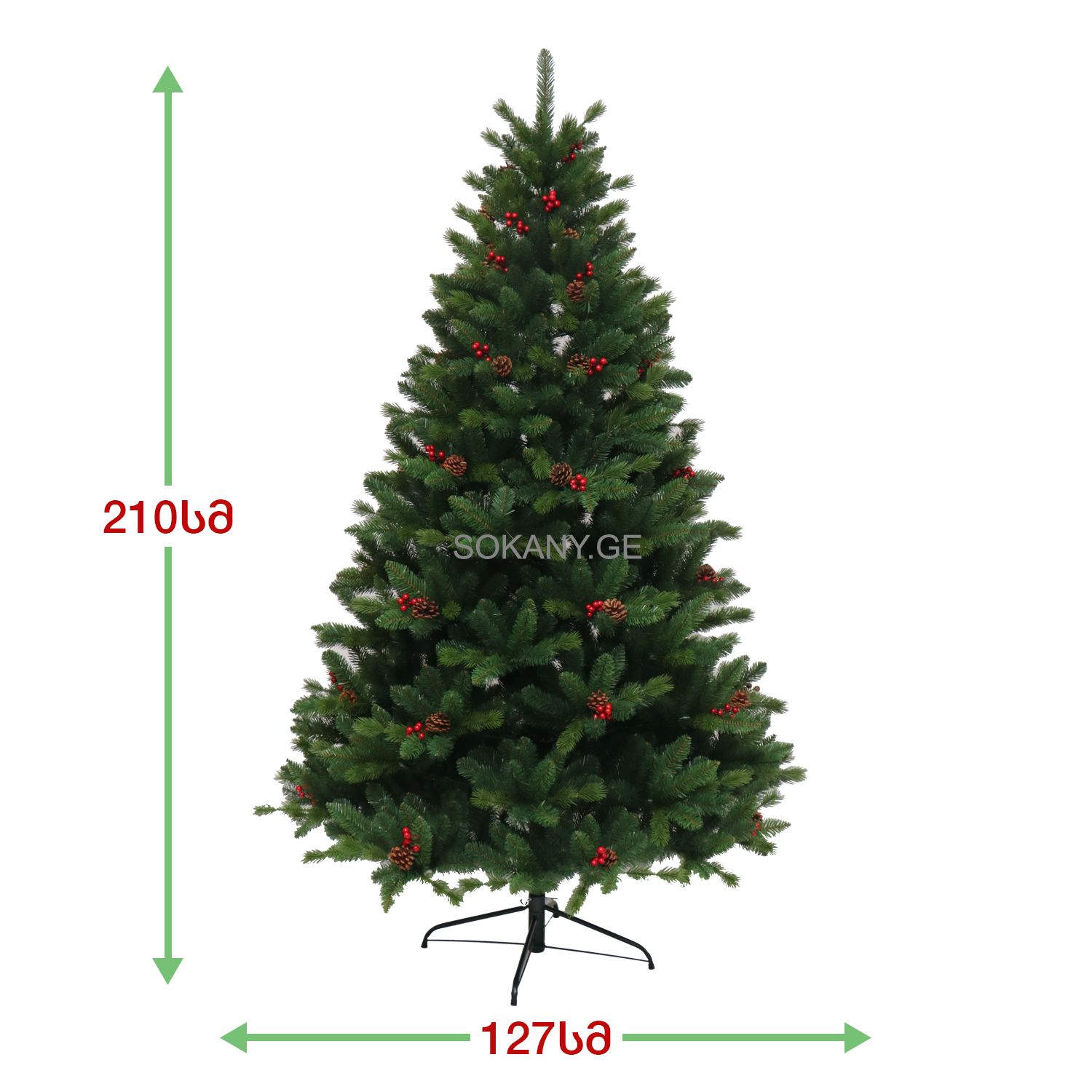 დამატებითი მახასიათებლები:"ნაძვის ხე, გაფორმებული გირჩებით და კენკრით. გამძლე დრეკადი მეტალის ტოტებით და ჯანმრთელობისთვის უსაფრთხო მასალისგან დამზადებული წიწვებით. მეტალის მყარი სადგამით და მთავარი ღერძით.