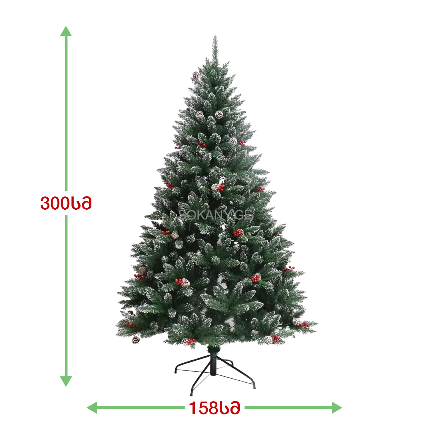 დამატებითი მახასიათებლები:ნაძვის ხე დათოვლილი ბოლოებით, გაფორმებული გირჩებით და კენკრით. გამძლე დრეკადი მეტალის ტოტებით და ჯანმრთელობისთვის უსაფრთხო მასალისგან დამზადებული წიწვებით. მეტალის მყარი სადგამით და მთავარი ღერძით.