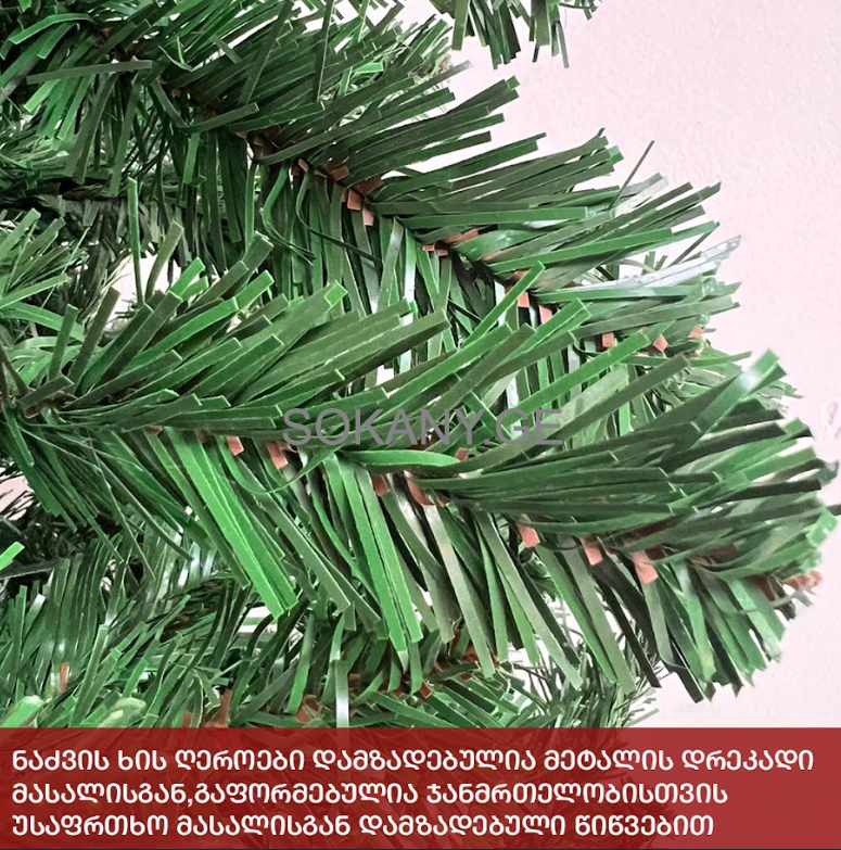 დამატებითი მახასიათებლები:სადა მწვანე ნაძვის ხე გამძლე დრეკადი მეტალის ტოტებით და ჯანმრთელობისთვის უსაფრთხო მასალისგან დამზადებული წიწვებით. მეტალის მყარი სადგამით და მთავარი ღერძით.