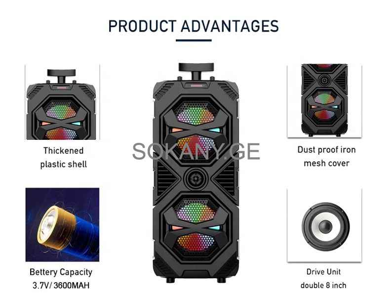 დამატებითი მახასიათებლები:პულტი/ხმის რეგულირება/LED განათება, კომპაქტური დიზაინი მძლავრი ხმის სისტემით